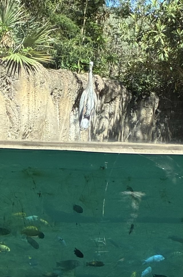 We went to the Fort Worth Zoo the other day and I got a kick out of seeing the wild heron fishing at the fish stocked hippo tank.