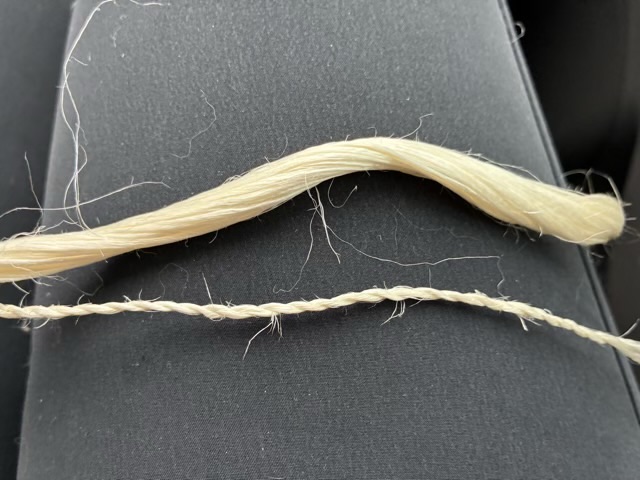 The fiber is enjoyable to twine. There are some very long fibers in the bundle, around 5-6 feet long. Twining goes better with a little sponge and a spray bottle of water so I can keep my finger tips moist as I twist.