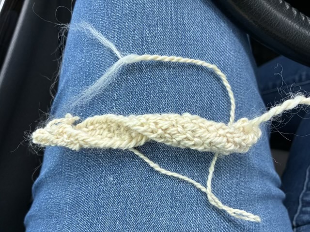 As I write this post, I’m wondering if the twist in my work is the stitch, or the method of construction I’m attempting. I’m working in the round, which is typical for nålbinding, but I’m working around a long base chain, which is a little different. I’ll keep on and see if things even out, either as I go, or after I block the finished work.