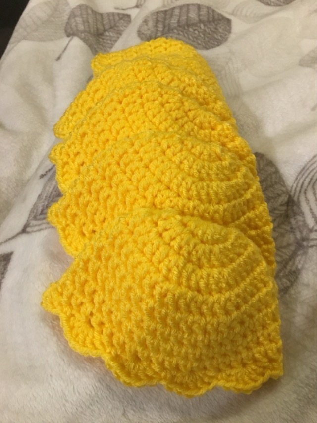In June 2017 I used up leftover acrylic yarn to make several baby hats.