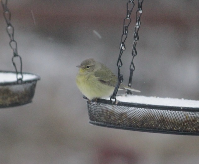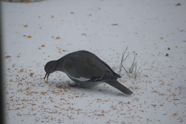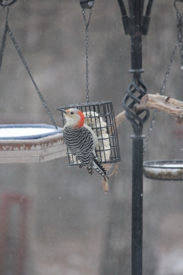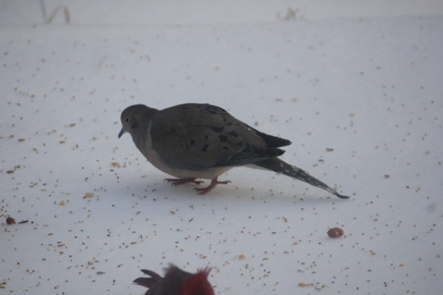 Photo description: red-bellied woodpecker hanging on a suet feederPhoto description: orange-crowned warbler sitting on a snow covered seed trayPhoto description: dark eyed junco eating seeds on the icePhoto description: mourning dove eating seeds on the icePhoto description: female downy woodpecker on a suet feederPhoto description: Harris’ sparrow eating seeds on the icePhoto description: Carolina wren sitting in a seed trayPhoto description: white winged dove eating seeds on the icePhoto description: American Goldfinch in its winter colors eating seeds