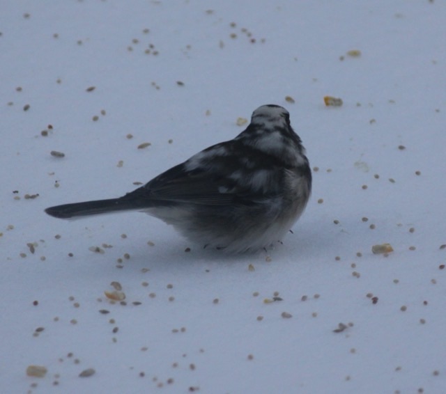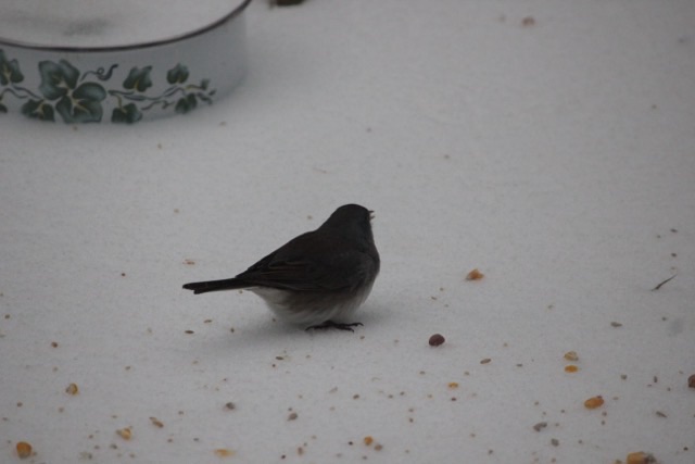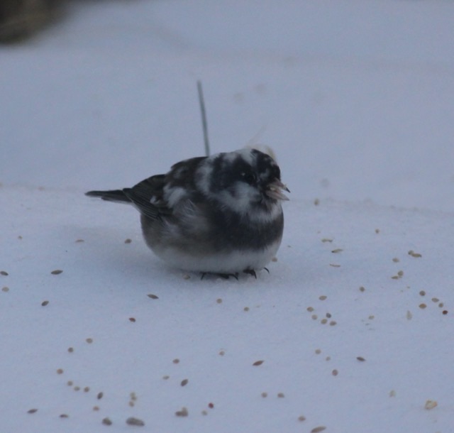 One of the entertainments during the cold lockdown was watching the birds on the back porch. I threw seeds out onto the snow (haha, “snow”, it was solid ice), and we watched from our kitchen table. I saw one unusually colored bird and snapped some photos. SamBiology on iNaturalist figures it is a piebald dark eyed junco. Neat.