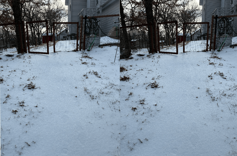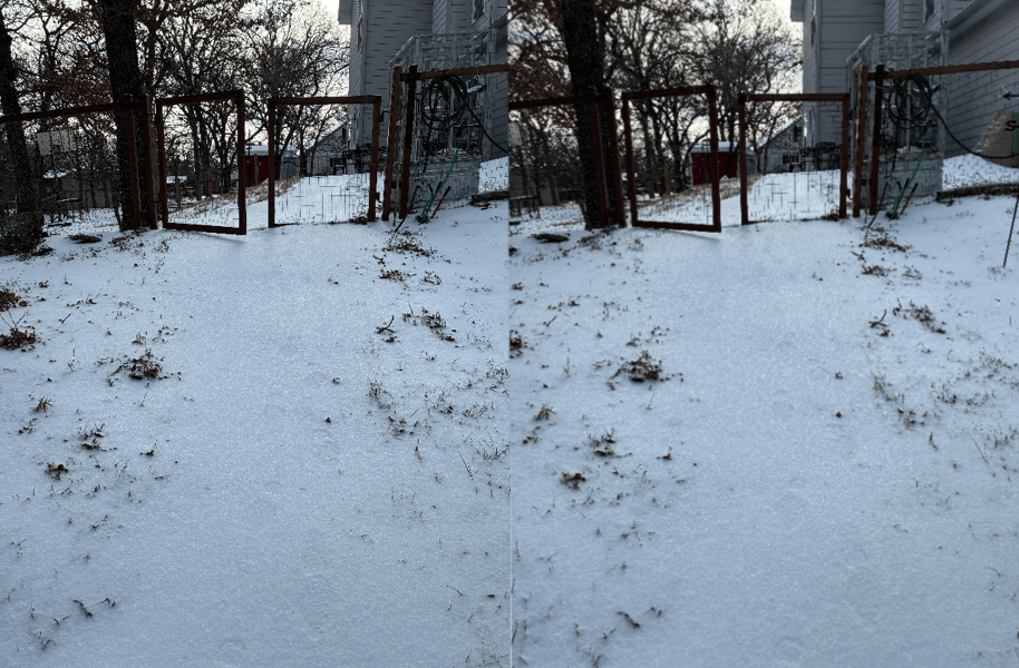 I did stop to take a pair of pictures of foot steps in the snow while I was out checking on the chickens (they are fine, cold, but fine). These are the stereoscopic photos, in parallel view and cross view (which I still can’t see).