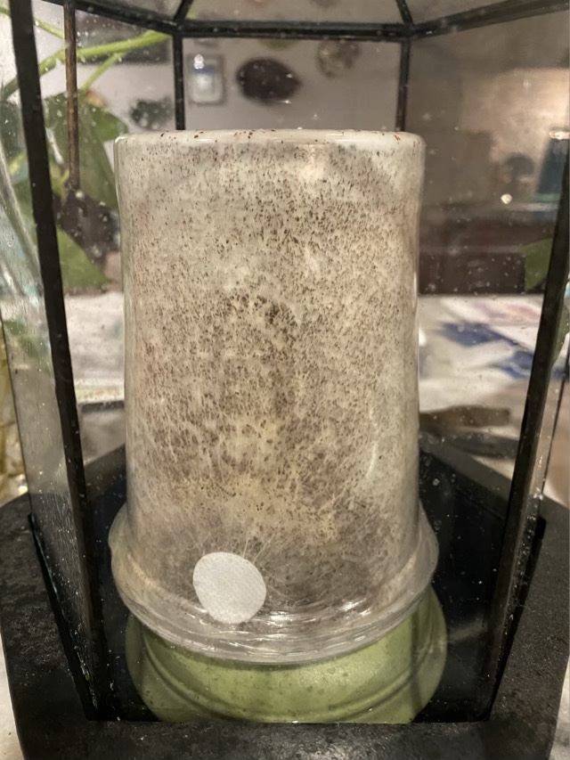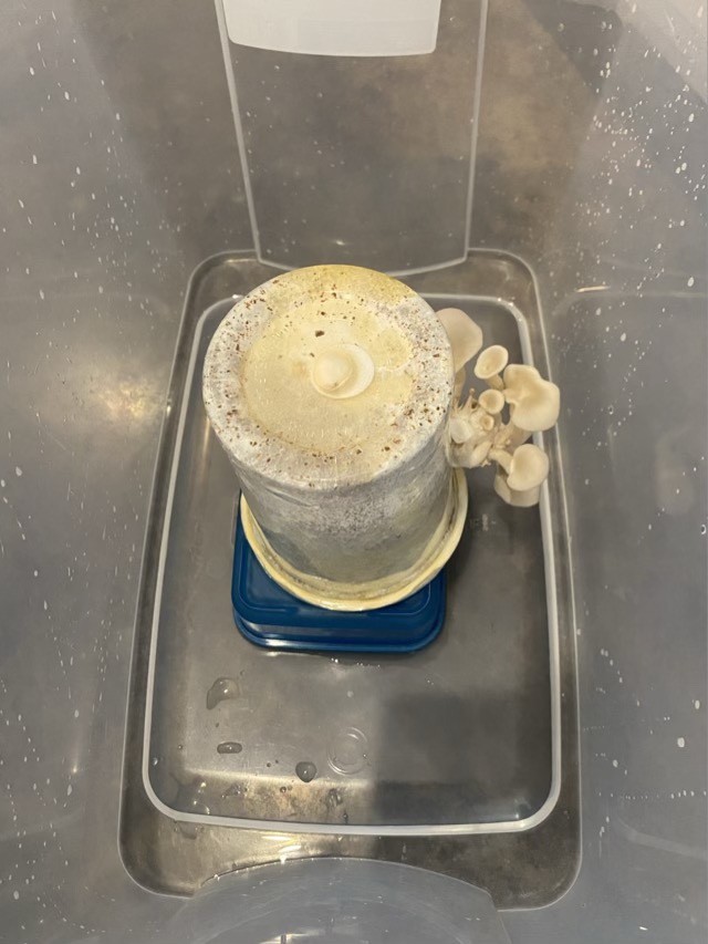 One of the things the seller said was that the fungus will stop producing mushrooms if it gets too dry in the original container. I opened up the container and added water. Two days later, more fruiting bodies sprouted. We’ll see if they develop into full mushrooms!
