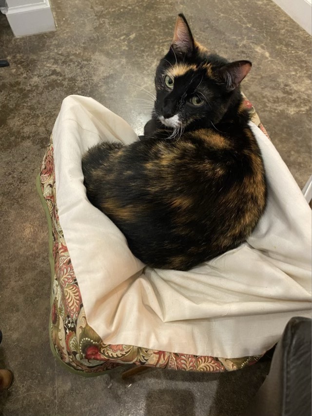My knitting bag next to my chair was my grandmother’s. It has a fold out wooden frame and inside pockets (pockets are important). With a kitten in the house, I need to keep it covered and keep him out of my yarn. I’ve tried several things, then rediscovered a basket lining I made years ago. Inside out, it makes a great cover. I would like to put some elastic in, to give it a snug fit, but even without it does the job of protecting my yarn. The kitten likes it, so my older cat, Izzy, thought she would give it a go.