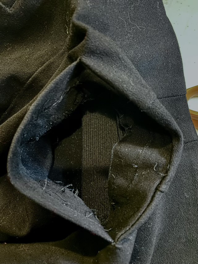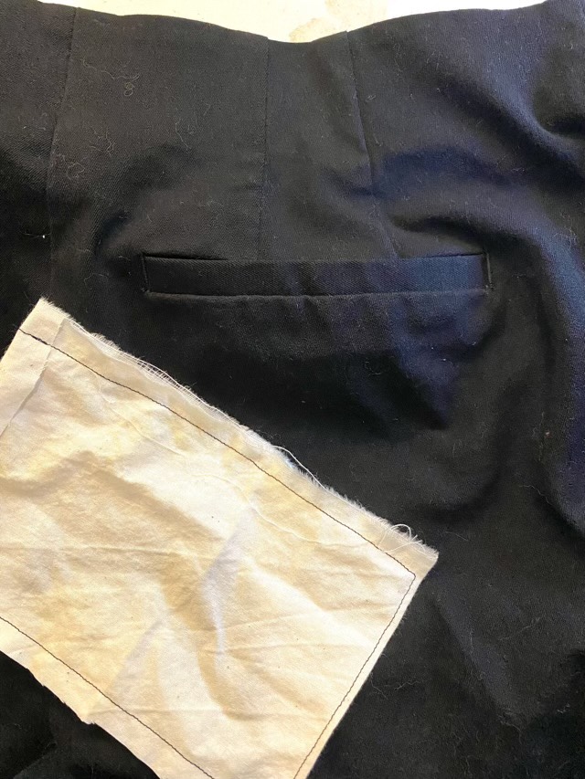 Fake pocket in women’s pants, with a simple cotton pocket ready to sew inClip the seam keeping the fake pocket closed, so it opensOn the wrong side, sew in the pocket over the pocket opening. You can fold in the raw pocket edges, and fold the pocket top out if you want to get fiddly. Sew along the front and back of the pocket opening, don’t worry if there are small gaps at the end of the seams, they will be at the top of the pocket.Pocket insert installed. Crises averted. Wrongs righted. Balance restored.