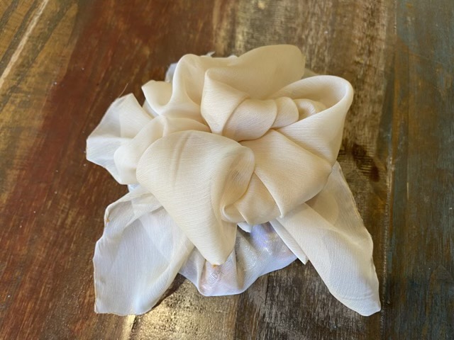 Last minute Valentine’s hack! To tie up some goodies in a bag, when you don’t have a pre-made bag, but you do have some fabric and some ribbon. This is like a hobo bag, but fancy, as the resulting tied fabric looks like a flower. I used a square of chiffon fabric and sealed the edges by passing them by the flame of a candle to melt them. If your sewing machine is up and running you could also hem the fabric, but the slightly melted edge works for this flower form. You could also use a pre-hemmed square of fabric. To tie the bag shut, I used about two feet of ribbon. I put the chocolates in the middle, gathered the ends together, then tucked the corners back under. I have made a short video on how to here.