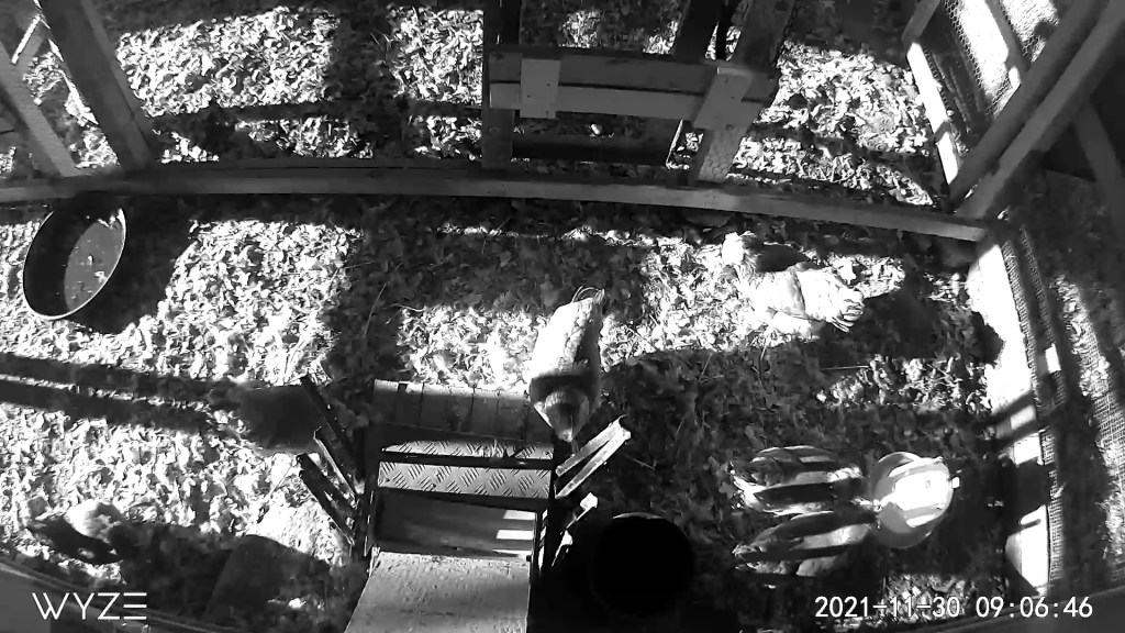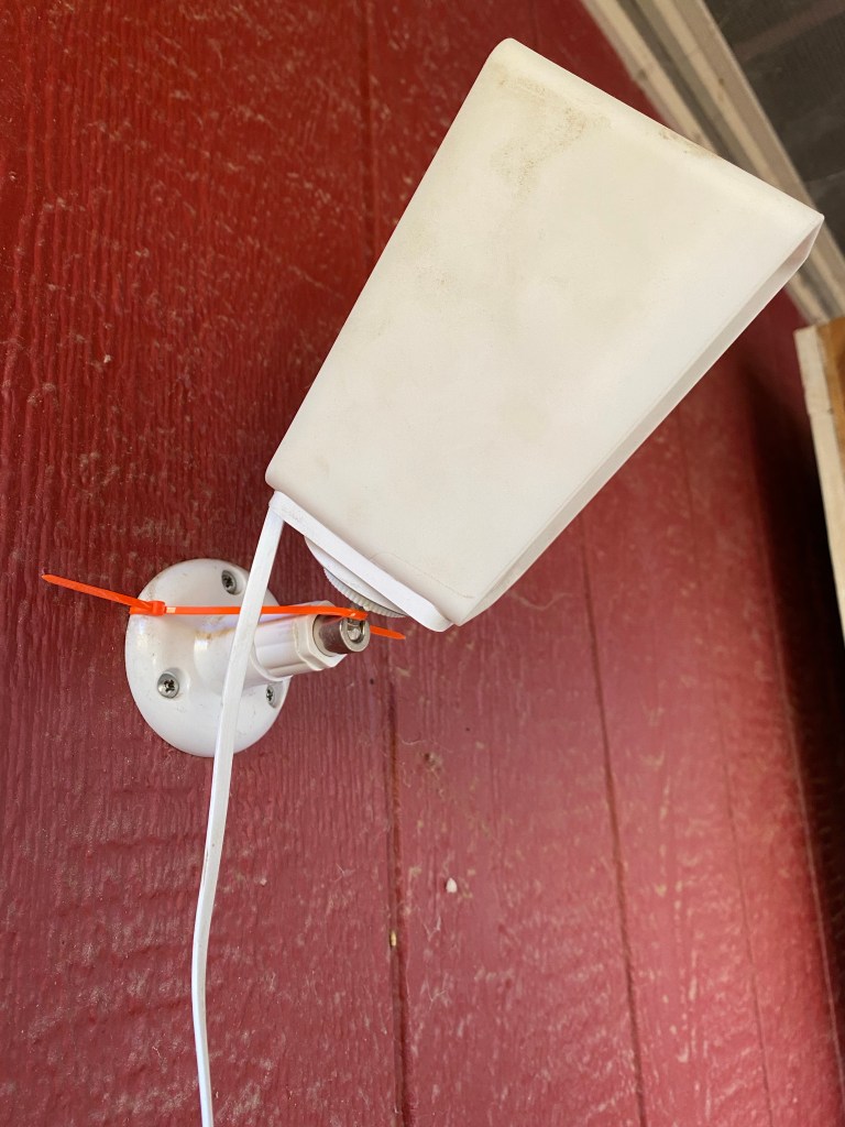 Cable ties used to prop up a webcam on the coop