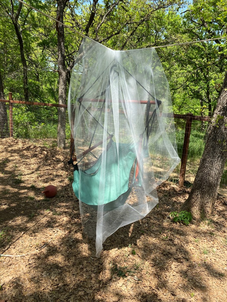 In an effort to keep the caterpillars from falling into my lap, and the random bird droppings soiling my yarn, I draped netting over my chair. Jury is still out on the effectiveness long term, but I didn’t have unwanted visitors that day.