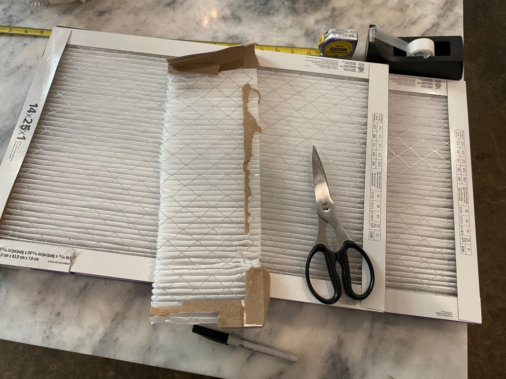 Mark the filter to the correct size minus 1/8” and use kitchen shears to cut off the whole endKitchen shears also work well to run underneath the cardboard edges and release them from the glueTape the cardboard end from the cutoff piece onto the main piece. Use a marker to change the printed size so you don’t make the mistake again.Install the fixed filter! Do remember to mark the date of change and dust the cover.