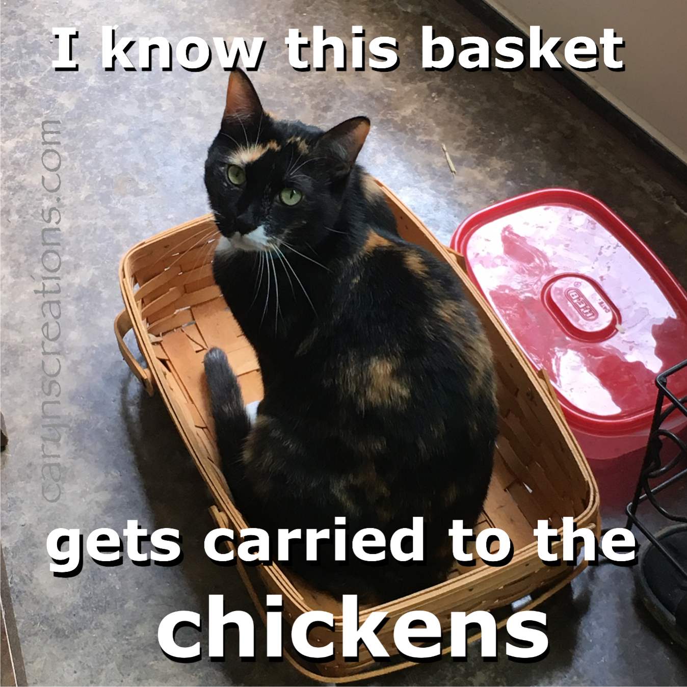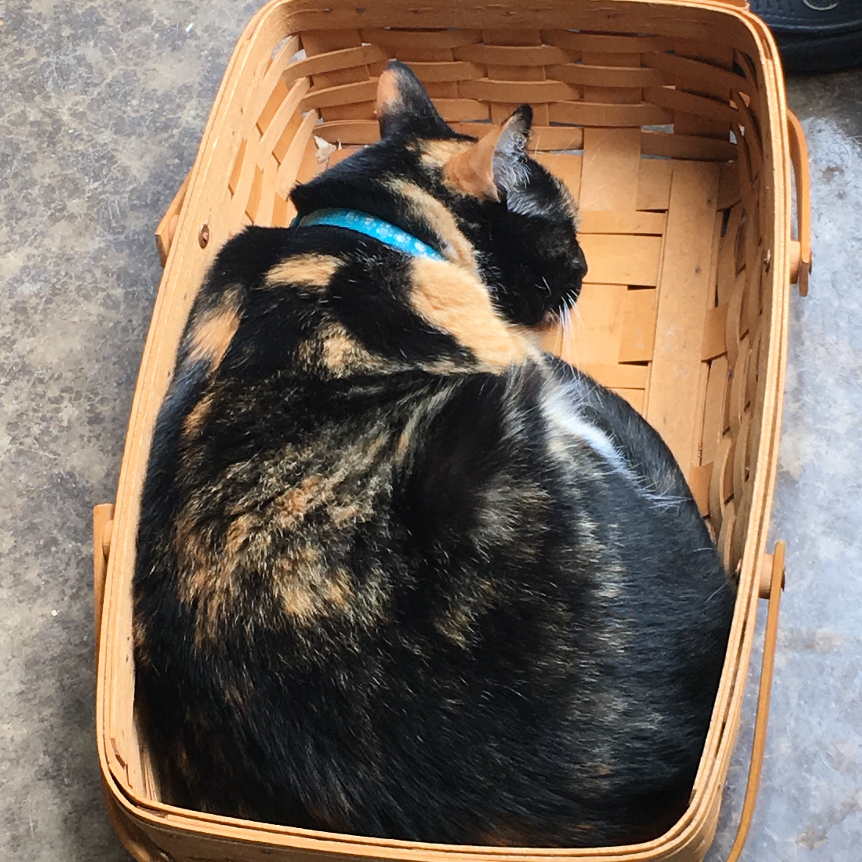 I’ve started to use a wooden basket to carry out ice packs and frozen gallon jugs to the coop to help keep the chickens cool. The pink plastic basket just wasn’t up to the task. My inside cat has seen the basket go out many times. So she decided to try and hitch a ride (or it was a case of “if I fits I sits”, she is a cat after all). I wasn’t fooled.