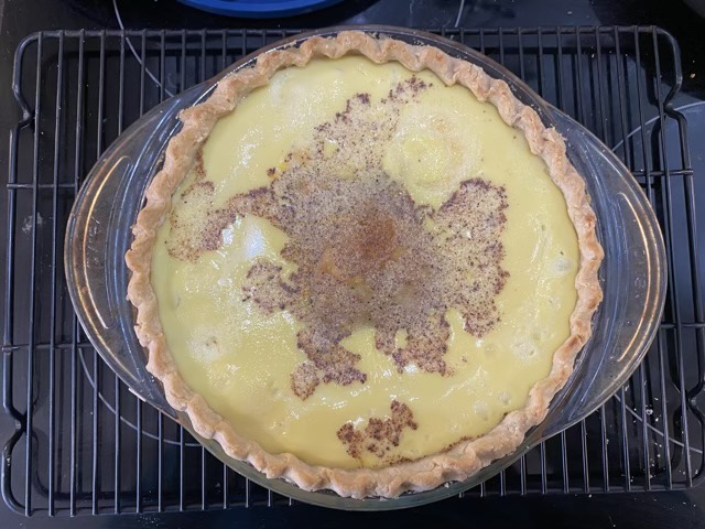 The second crust I blind-baked with pastry weights, but made the mistake of removing the weights and cooking it a little longer. It puffed up and cracked. Ugh. Here is a good site for crust crack issues, especially creating a spackle for cracks and using an egg wash to keep the filling from seeping. The recipe I used for the custard was easy and tasted good is from The Better Homes and Gardens New Cook Book. I won’t put the nutmeg on top before baking, as in the instructions, because it did strange things to the surface. I don’t know why I don’t make this more often, though. Yum.