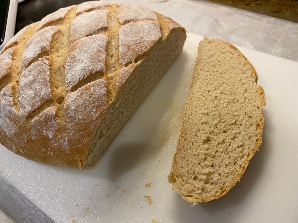 This is the first shaped loaf I have made in over 17 years. Gluten-free bread has to be baked in a pan or form, it is too slack to hold shape like wheat bread can. I wanted a simple straight-forward bread, so looked up Paul Hollywood’s crusty cob loaf instructions (I adore watching the Great British Bake Off). It certainly smelled good baking! It tasted nice as well, and didn’t cause the stomach distress I usually get within 30 minutes of eating modern wheat (although it seems there are several strains of “modern” wheat and I don’t know if I am sensitive to one but not another, but that is an experiment for another time). I ate a bit at first, waited half and hour, then ate a whole slice. The next day I made banana bread. Then cream puffs (the bread flour is too heavy for pastry, my gluten free mix worked better). Then simple egg noodles (mix flour and egg, and squeeze through a pastry bag or clipped plastic bag into boiling stock). I’ve basically been steadily eating it for a week. I’m not 100% sure that my body is OK with it, but at least I don’t feel like I have a war waging in my digestive tract. I will continue to monitor my digestion and mood, but reduce my intake because, frankly, baking everyday will make the scale unhappy!