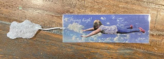 Every year I make bookmarks for my youngest’s teachers. The teachers love them, and my youngest gets enthused about ideas. This time she wanted herself flying through the sky, so we took her picture laying on a bench, and I Photoshopped her onto a sky with fluffy clouds (since she chose to wear her fluffy cloud sky shirt). But what to do for the tassel? I went digging through my stash, looking for white felt, but instead found some poly batting. I could work with that. To make the clouds, I cut out a oblong of batting, then melted the edges with a candle flame to reinforce the edges and make it more cloud-like.