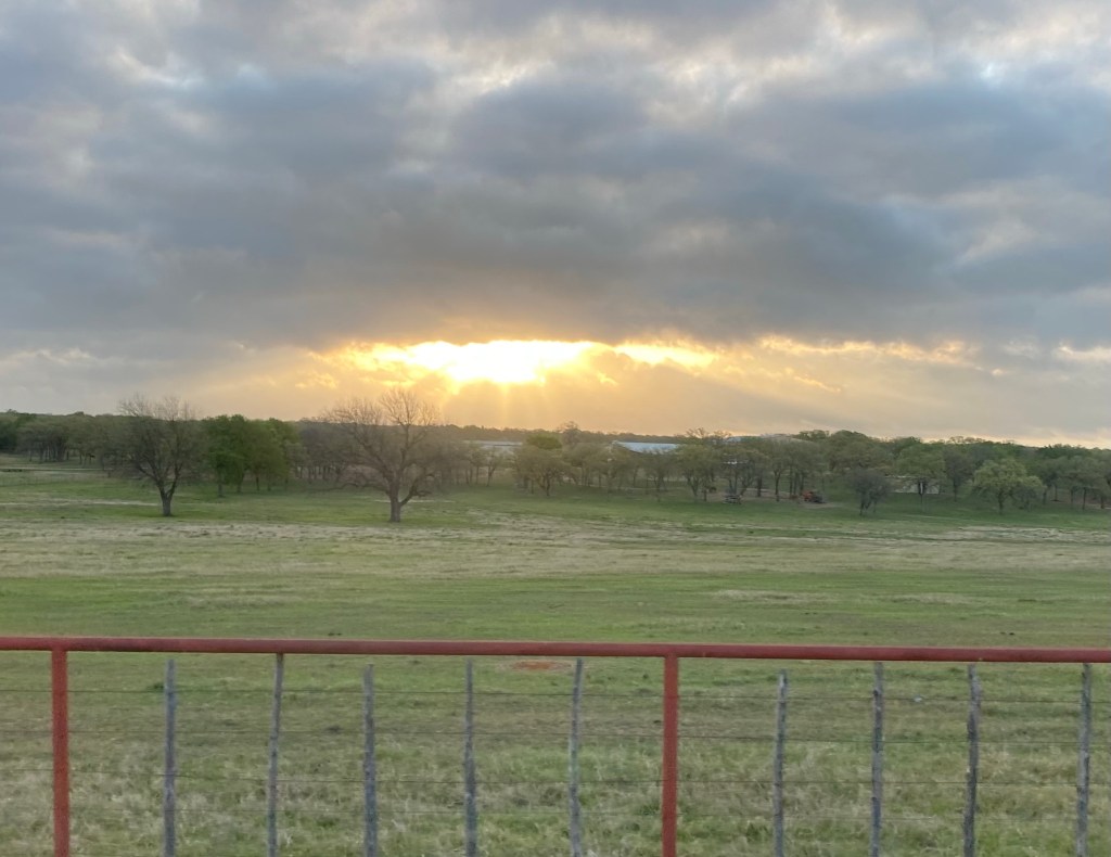 We had a rather striking sunrise the other day. I snapped a picture (I was not driving), then realized after that it looked like a giant eye. And not really a benevolent one. I had “From a Distance” by Bette Midler stuck in my head the rest of the day.