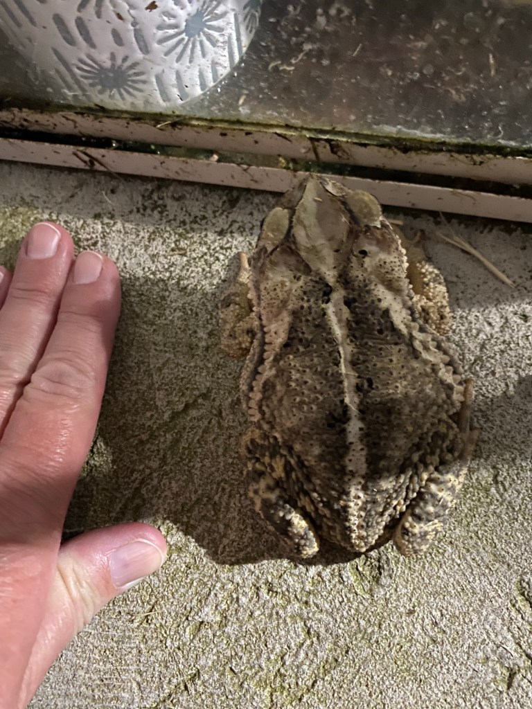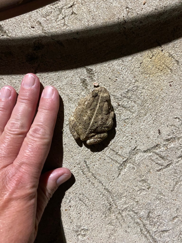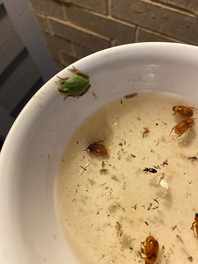 When we first moved here, there was an army of baby frogs in the summer; tiny jumpers here, there, and everywhere. In the intervening years, we have seen less and less little ones, but a fairly consistent number of adults. When the snake ate the Gulf Coast Toad from the backyard, we stopped seeing any toads by the back door (so apparently it was just one toad that hung out on the doorstep asking about tea). Now, we are seeing younglings again! Not an invading hoard, but toadlets here and tree froglets there. I picked up a water dish to dump the June bugs and realized not all the critters were insects. A little green tree frog regarded its situation for a moment before hopping off. Maybe we will also get another threshold toad (although I have not missed shooing a toad from the door).