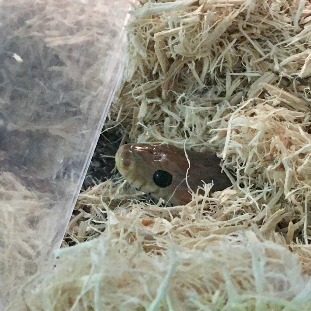 We can tell when my eldest’s corn snake is hungry because he “hunts”. He just peeks his head out of the shavings and stares into his feeding cage. (We have a separate clear container in his main cage where we put the thawed mouse, so he doesn’t ingest aspen shavings with his dinner.)