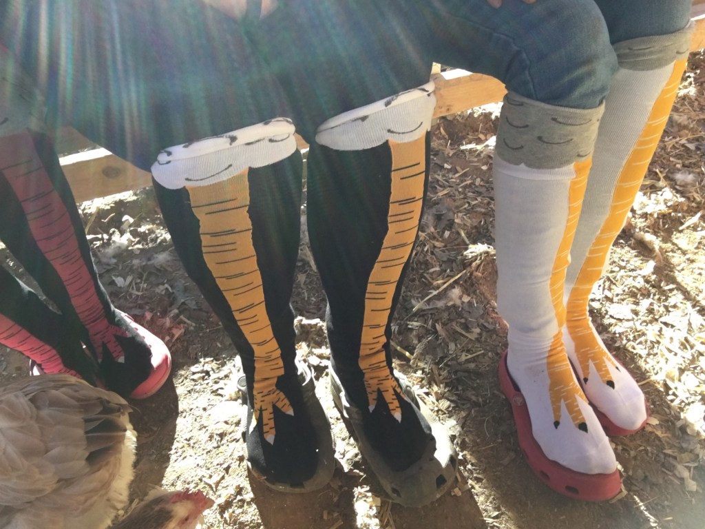 My aunt (on my husband’s side) gave us girls chicken feet socks! We all wore them to go out with the hens. The hens were not fooled, but did check to see if the colors on the socks were edible, then went back to demanding mealworms.
