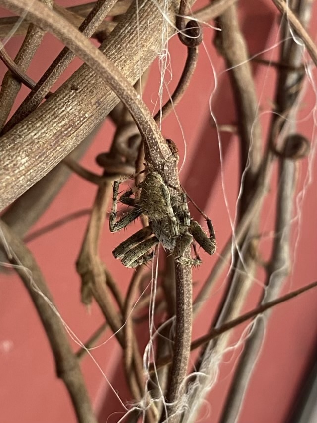 I saw the spider as I was leaving the house and thought it odd that it was sitting there exposed. I pulled on some of the glue threads and it moved, so I gently pulled the threads away. It turns out the spider was tangled in the thin strands of plastic. When I pulled away enough of the elastic string, the spider mobilized and moved to a more protected area. I finished taking all the hot glue strands off the sculpture. I had no idea they were capable of entrapment.