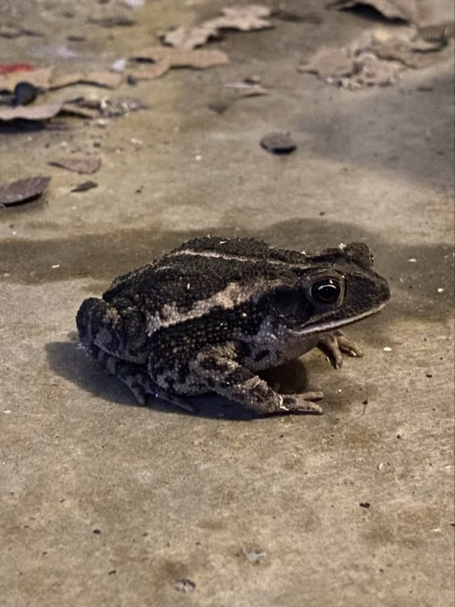 I have a Gulf Coast toad living in my garage. I went to take out the trash and he was sitting in the middle of the floor, not caring about my movements at all. Usually he hops away from me, but not today.