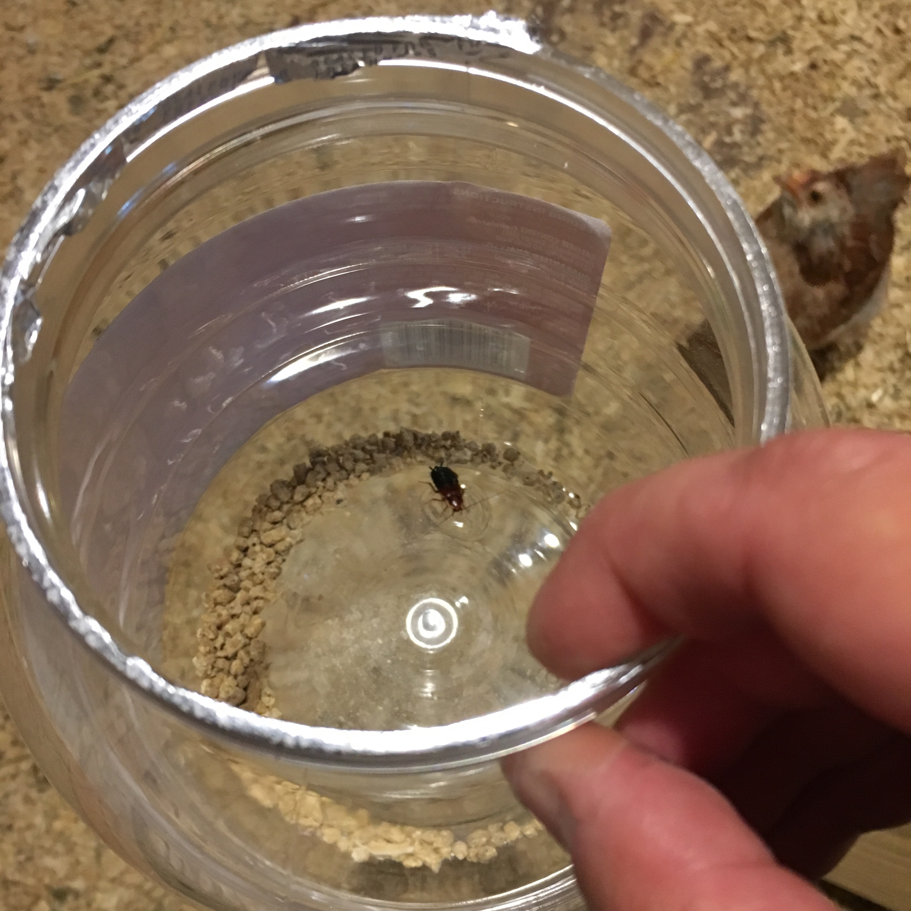 A couple different bloggers capture the cockroaches in glass jars and then in the morning, let them loose for the chickens. Rather than spray pesticides, we decided to give this a try. We had an empty dog treat jar, plastic instead of glass, but with curved sides at the top of the jar. We put some chicken feed in the bottom, and put it on the floor of the coop.