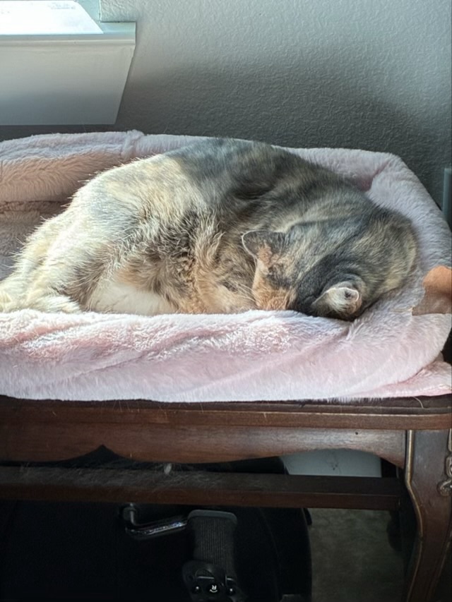 Photo description: dilute calico curled up in a pink fuzzy handmade cat bed mounted on an old ornate wood base