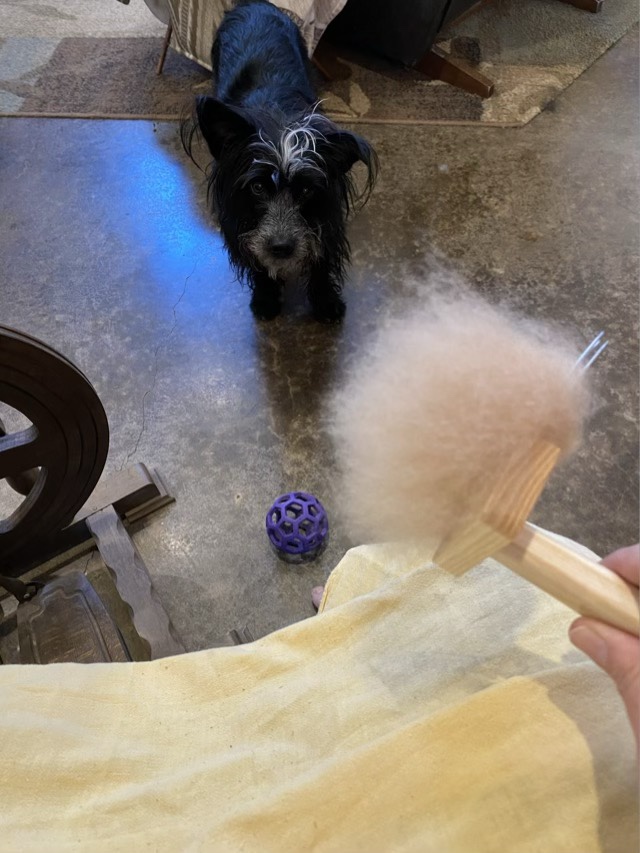 I knew I had another box of blended fiber by Anniewhere, and I found it while looking for what to spin next in my prepped fiber box! Yay! I think I’ve spun 4 oz of this blend so far, which consists of Merino wool, Blue Faced Leichtester, Alpaca, Tussah Silk, and Finn Wool. I’ve been using it to test out different spindles, so I continued that and dug out a 3D printed Turkish spindle that I bought at a fiber festival. It spins beautifully and even though I have to use a half hitch at the top, rather than a hook or notch, I haven’t been dropping it as much as I feared.