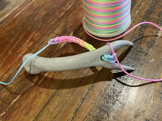Photo description: rainbow hued satin cord made into a braided cord using an antler lucet fork.