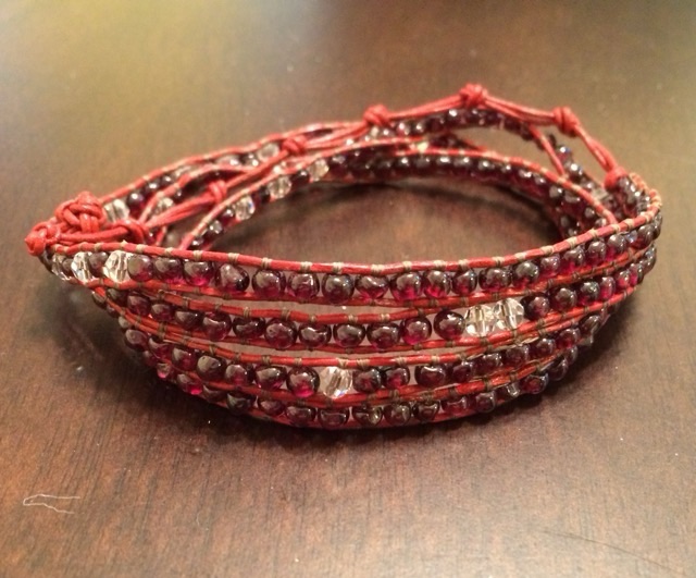 Photo description: red wrap bracelet with four wraps of natural garnet and quartz beads sewn between two leather cords