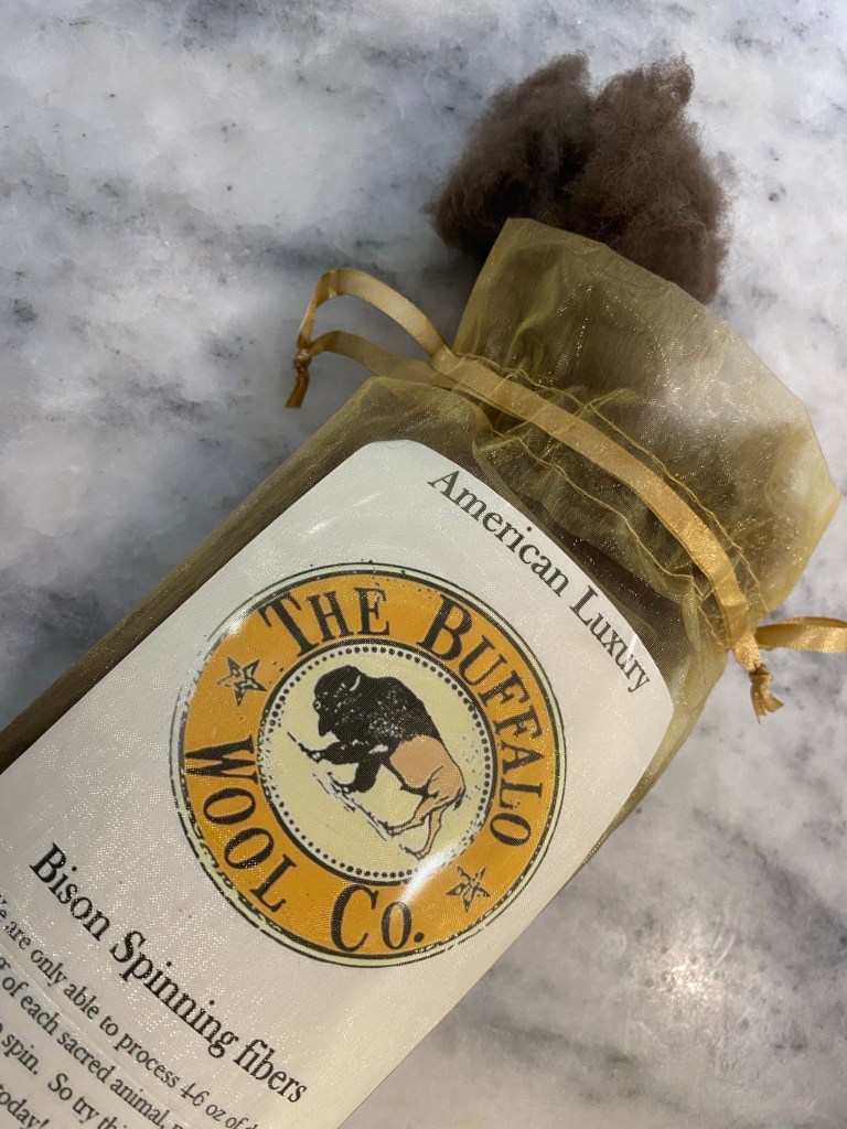 Buffalo down sounds like it comes from buffalo wings, but it is not feathers but the fine hair from the North American Bison. I love the opportunity to work with local fibers (and support local) and was so excited to find a nearby supplier of buffalo down. I grew up eating buffalo; it is a great low fat protein. To be able to use more of the animal is fantastic. The Buffalo Wool Company (thebuffalowoolco.com) uses fiber sheared from the hides of bison being processed for meat. Usually this fiber would be burned off, but they collect it and make hats, gloves, socks, and spinning fiber!