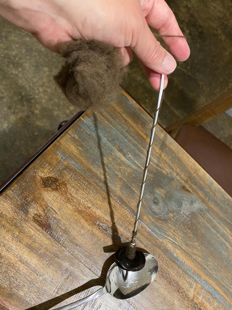 The owner was kind enough to share spinning tips as well. He said to spin “fast and fine” and to hold a small amount in my palm and spin off the pinch. I decided to use the tahkli spindle I made from an old button since it spins very fast and works well for cotton which is also a short fiber. I’m sticking with my spoon as a spindle rest because the handle is convenient.