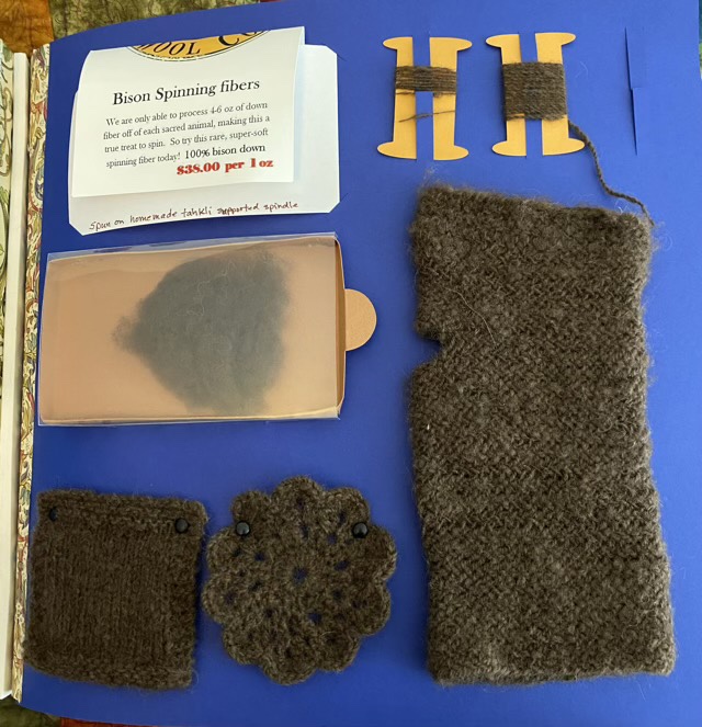 Photo description: Clockwise from top left: “Bison Spinning Fibers” card; single ply yarn; two ply yarn on a paper bobbin; one nålbound wrist warmer; crocheted lace round; knit square; loose bison fiber