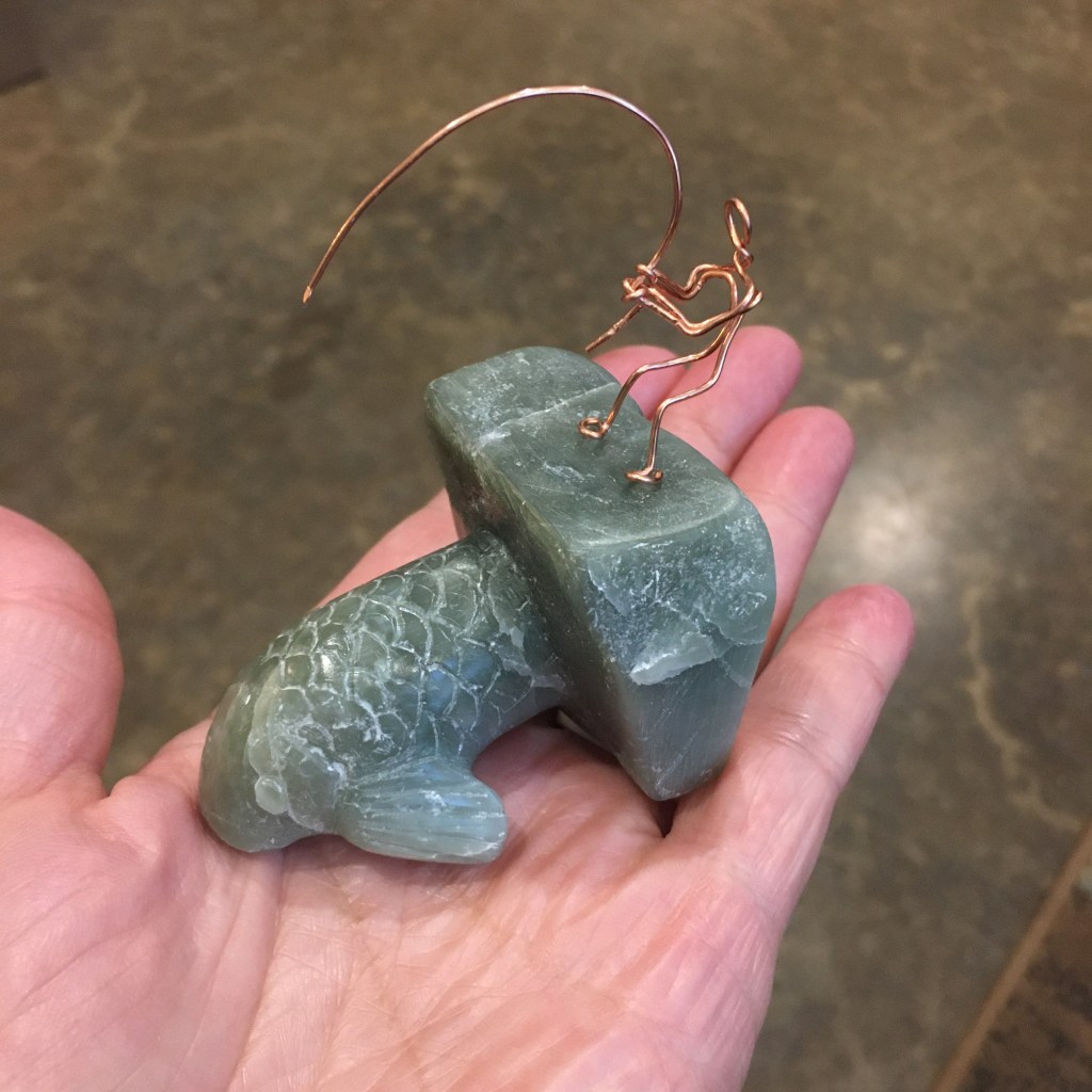 When I was pleased with the curves, I then sanded the riffler marks out and set about carving in details with an awl and knives. I was hesitant about carving scales, but this time the stone told me quite clearly that it wanted scales. I moved inside for this, since it didn’t produce nearly as much dust as shaping. When the scales were carved in, and I was pleased with the depth of the definition of the gills and eyes, I did another light sanding with 400 grit sandpaper. Then to get some gloss, I applied three layers of microcrystalline wax. Wow, the shine! My youngest thought that there should also be a fisherman, so I made a small copper figure pulling on a bent pole to reel in the massive fish. I drilled two tiny holes on the top of the ledge, and there are two wire spikes on the feet of the fisherman that fit in the holes. I am pleased with the motion of the wire figure; he is working hard to land that fish!
