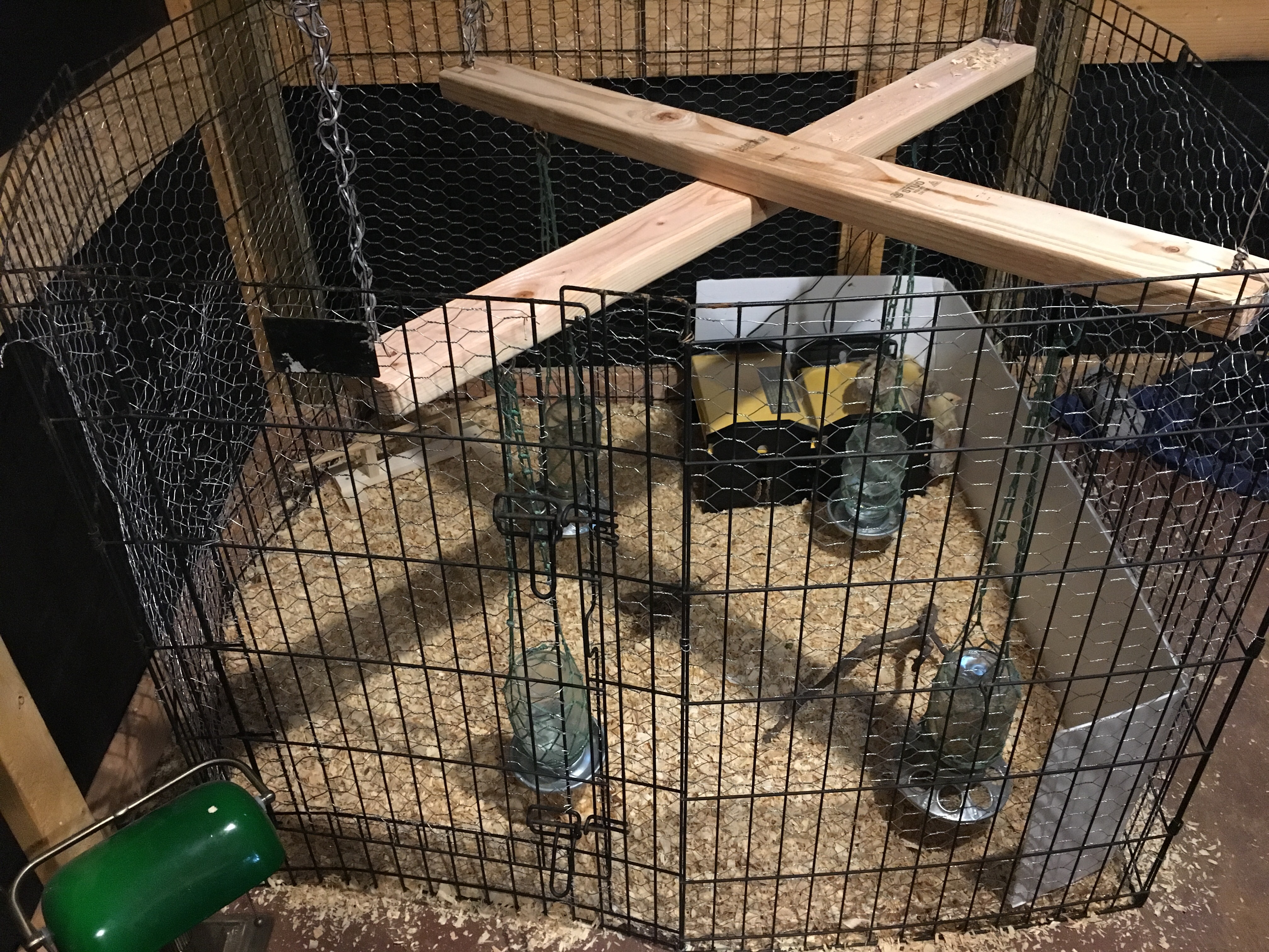 What a big day! We decided the best way to give the chicks a bigger enclosure was to line the old dog cage with chicken wire. We put pine shavings down inside and moved them in during the morning. They seem to appreciate the larger space. We rigged some scrap 2×4 together and hung it from the rafters and added metal eyes to hang the water and food jars in the new space. We had to adjust the height a bit, but it seems to work without too much swinging.