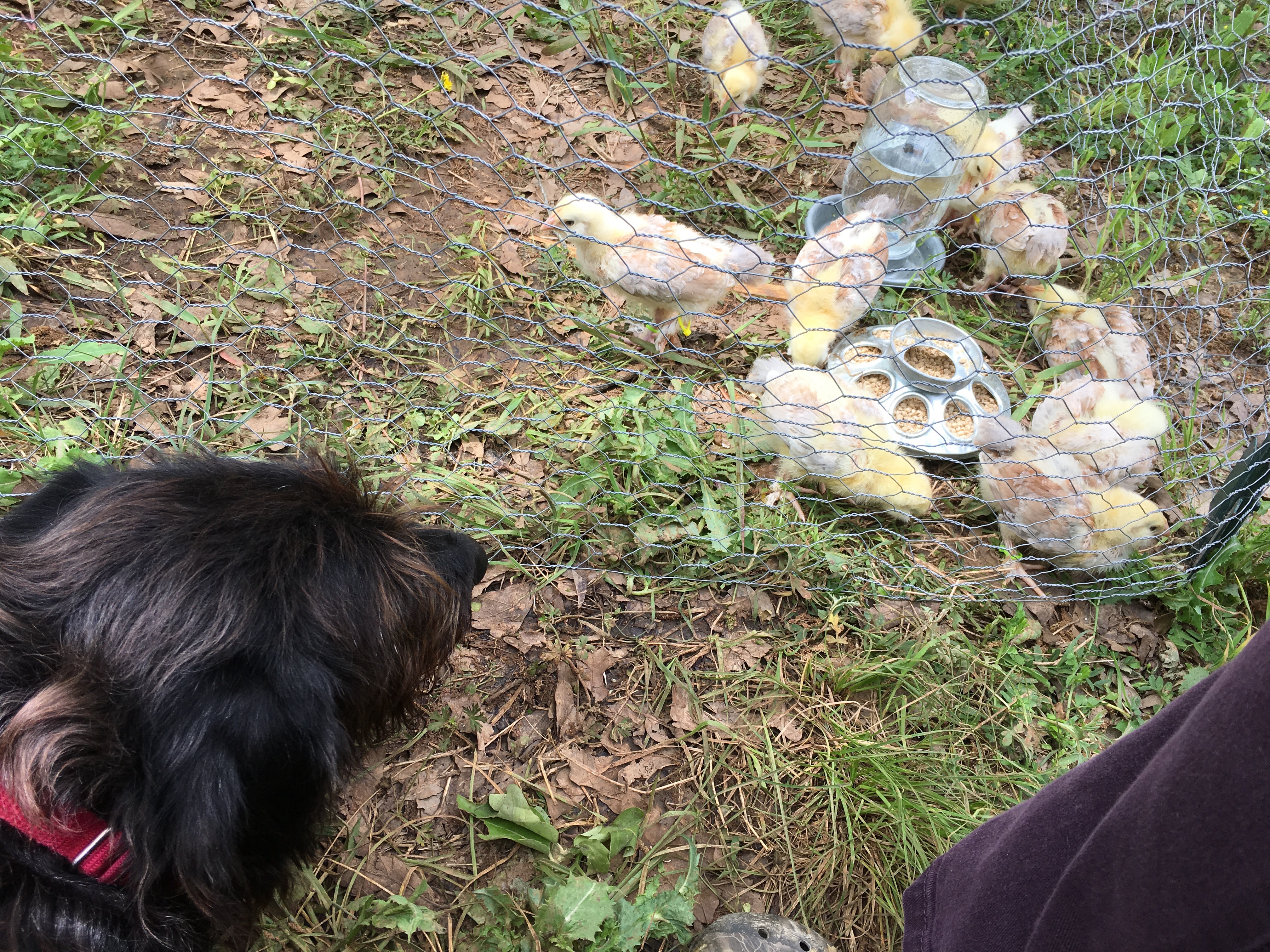 The chicks also had their first outside time. They seemed to enjoy running on the dirt and picking at leaves. We did another step for training our dog and had him lay down by the cage while the chicks moved around.