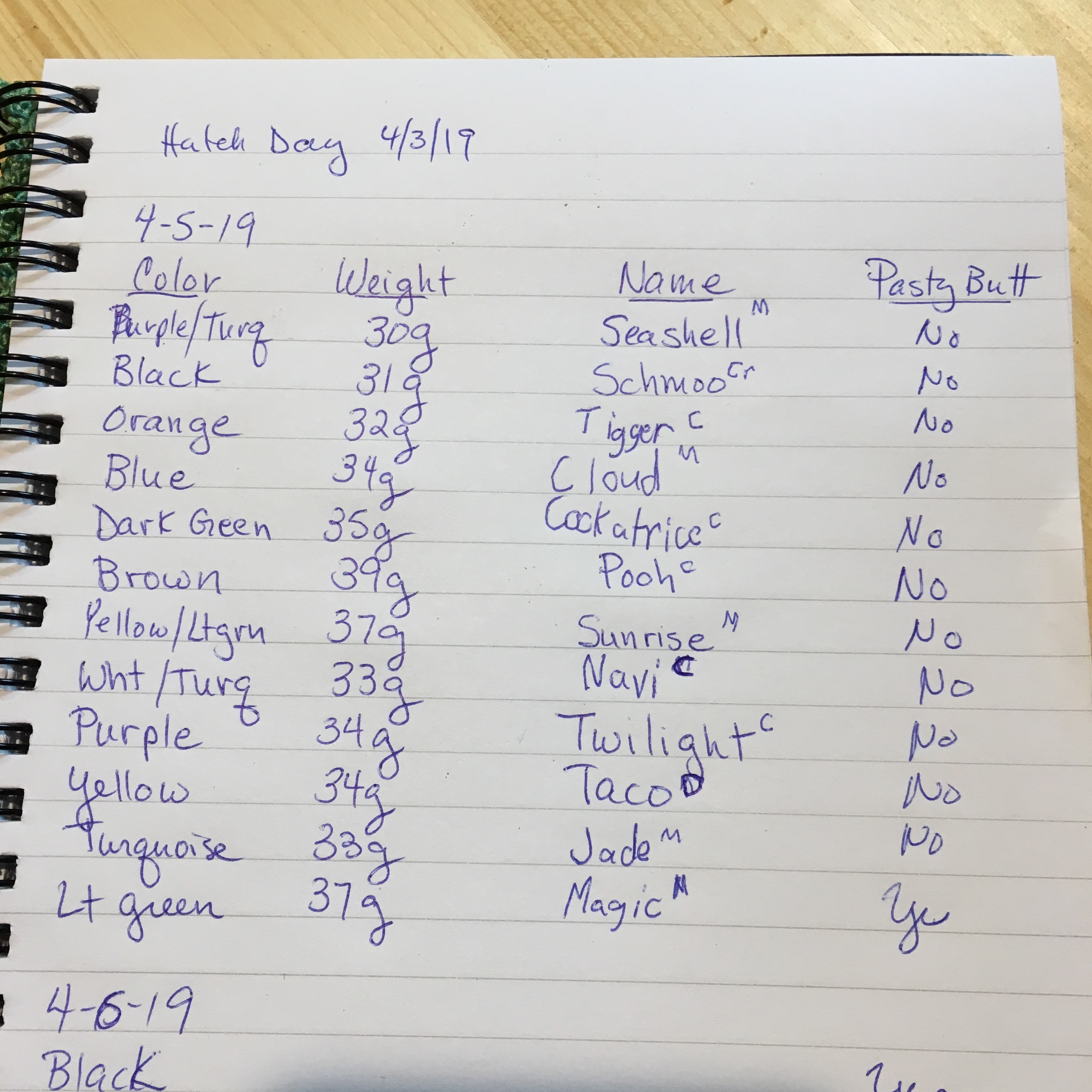 We banded, weighed, and named all the chicks, and made a little chart. (The marks next to the names indicate who named the chick. Each child named 5, and my husband and I named one each.)