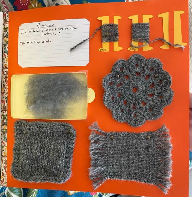 I did a fiber sample page for the Corriedale wool I’ve been using for teaching spinning. The woven sample is my best yet; I started the weaving with a pass of twined weft away from the edge of the loom. My weaving then stayed more even and consistent to the end, where I did another twined pass. The twining keeps the weaving in place better too, so I didn’t need to make knots. If I were making a piece that would see more action than laying in a book, I would secure the fringe better, either with more twined passes, or knotted or sewn fringe.