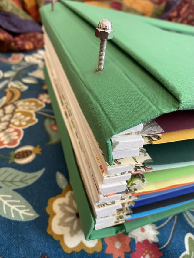 I’ve been quite frustrated with options for expanding my fiber book. The longest binding post screws I could find were not long enough, and the “extenders” had multiple reviews that that the threads didn’t fit, and I couldn’t find extenders that came with the caps. Bah. Time for a trip to the hardware store, specialty fasteners to the rescue. I found 5 inch threaded rods and some acorn nuts. They aren’t as fancy as a binding post, but they get the job done and I can probably fit another 10 pages in my book. I did have to adjust the cover to accommodate the acorn nuts, but it worked just fine to unfold the edge. A photo book this size would be very heavy and unwieldy, but my fiber pages are light and have thick spacers, so it works. I suppose I could separate up the pages into different books (shocking, right?), but right now I’d rather spend my money on fiber than book covers.
