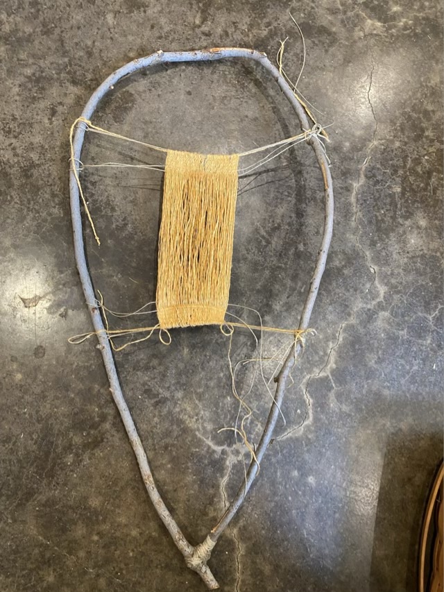 I’ve started a new project using the processed flax fiber from Sally Pointer’s twine kit. I’m making a twisted loop bag and twining the cordage for it as I go.