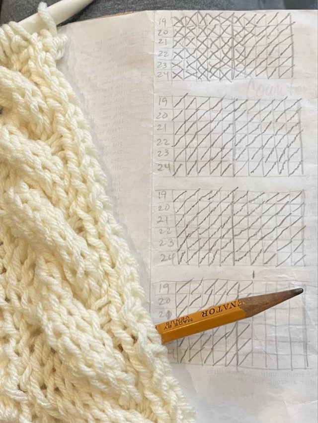 I’m still plugging away at finishing Grandma’s blanket. I have a renewed fervor for finishing, since I now have five projects in queue. I’m currently working on the border pieces, which are mostly a five row repeat. At this point I have the five rows memorized, but to keep track of where I am, I made a simple chart. Since I have to make two, I make the first leg of the X for one side, and the second for the other. Then they should come out the same length.