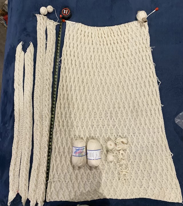 I have four borders and most of the center field done of Grandma’s blanket. The side borders are not finished because the plan is to maximize the length of the blanket with the yarn I have remaining. The pattern calls for tassels, but I don’t like tassels (because they become a tangled mess), so I’m going to use the tassel intended yarn to make the blanket longer (we have tall people in our family). The yarn remaining is laid out on the center portion. I will use one skein to make the length, and the other skein for the join technique I want to use. I consider this a calculated risk, not yarn roulette.