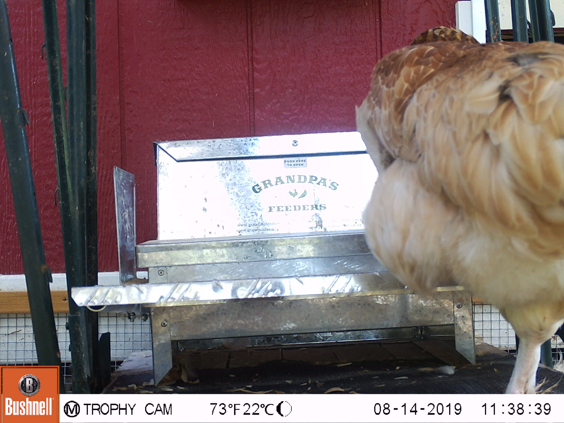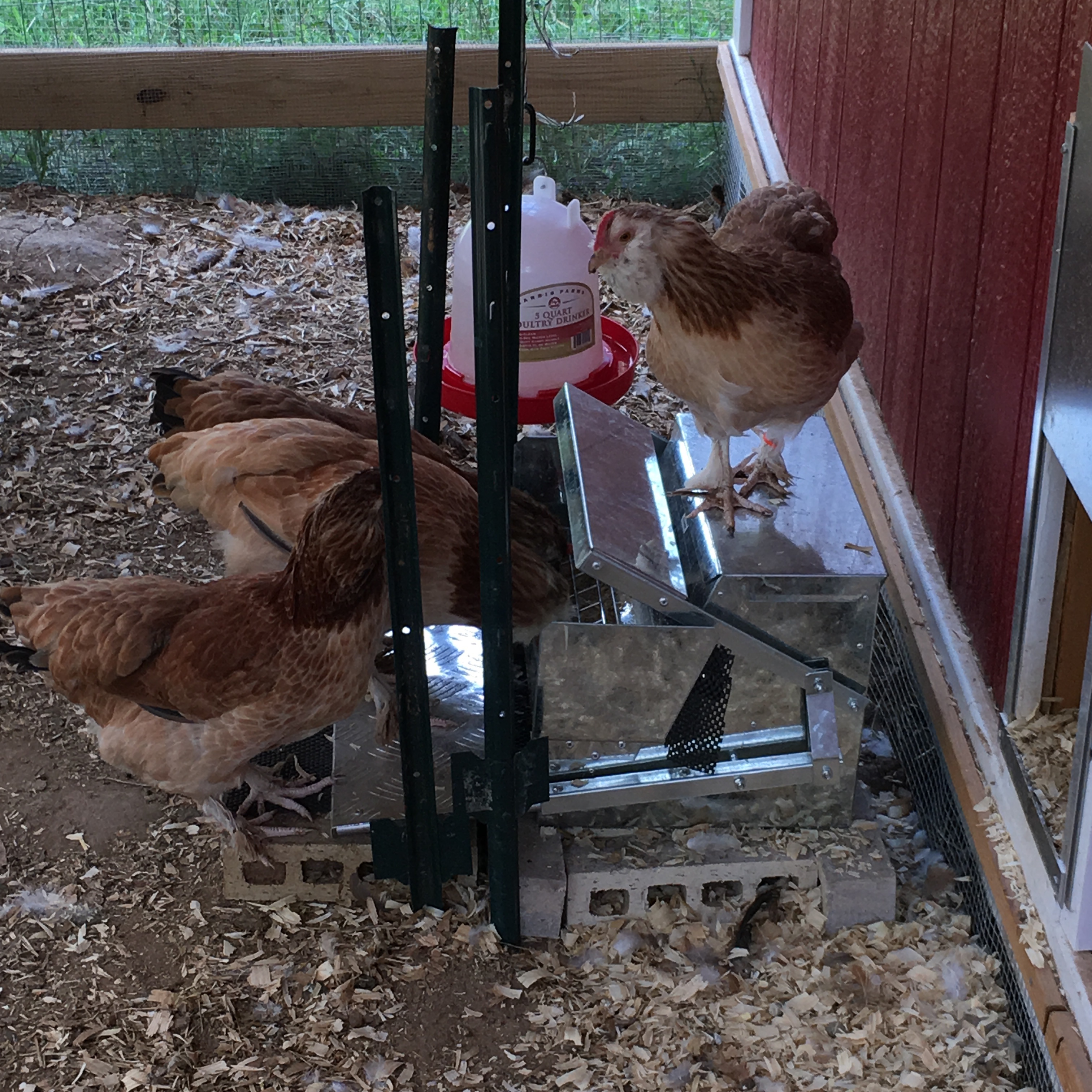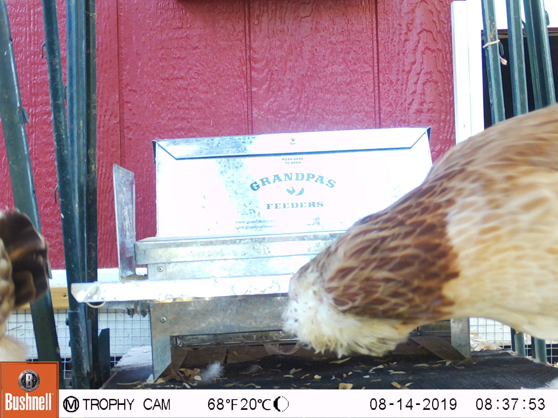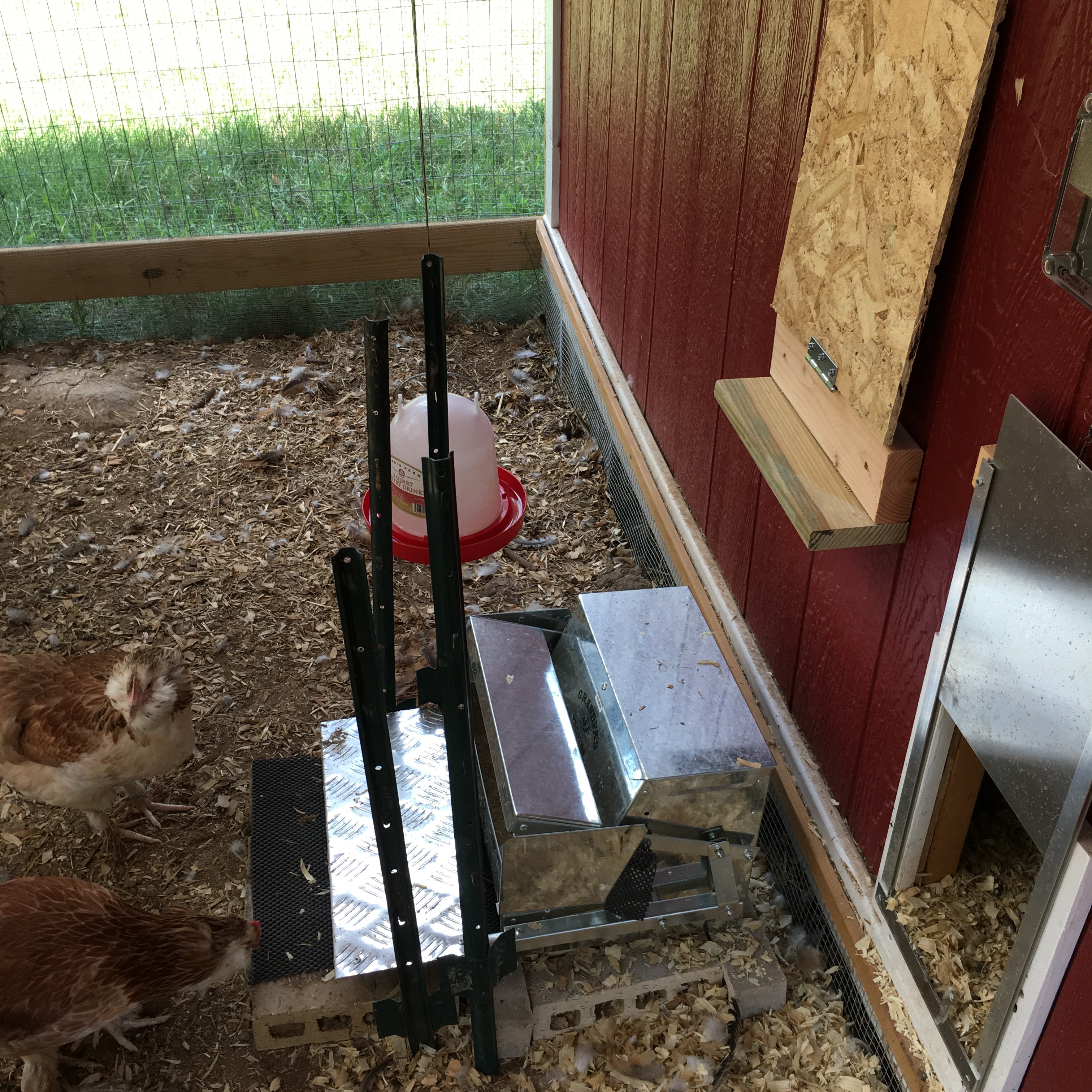 Another advantage of the hanging feeder is that I can see the food level from a distance. A disadvantage is that it is open on the top and if we get a heavy rain storm I loose a batch of feed to the wet. I’ve moved the feeder farther inside the porch area of the coop to see if that fixed the weather problem. Overall, the hens prefer the hanging feeder, and the hanging feeder is a fraction of the cost of a Grandpa’s Feeder.