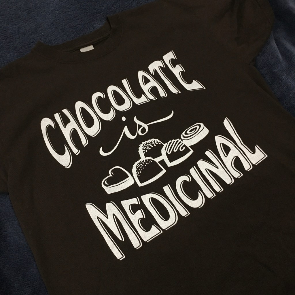 I created the graphic in Adobe Illustrator and used my Cricut cutter to cut the vinyl. I like the negative space “Embrace”. I also put this out on my Redbubble shop as a t-shirt design in white and black. The solid color prints come out nicely, with a bit of variation from the knit material, which I like. Below is a different design I had printed on a brown shirt.