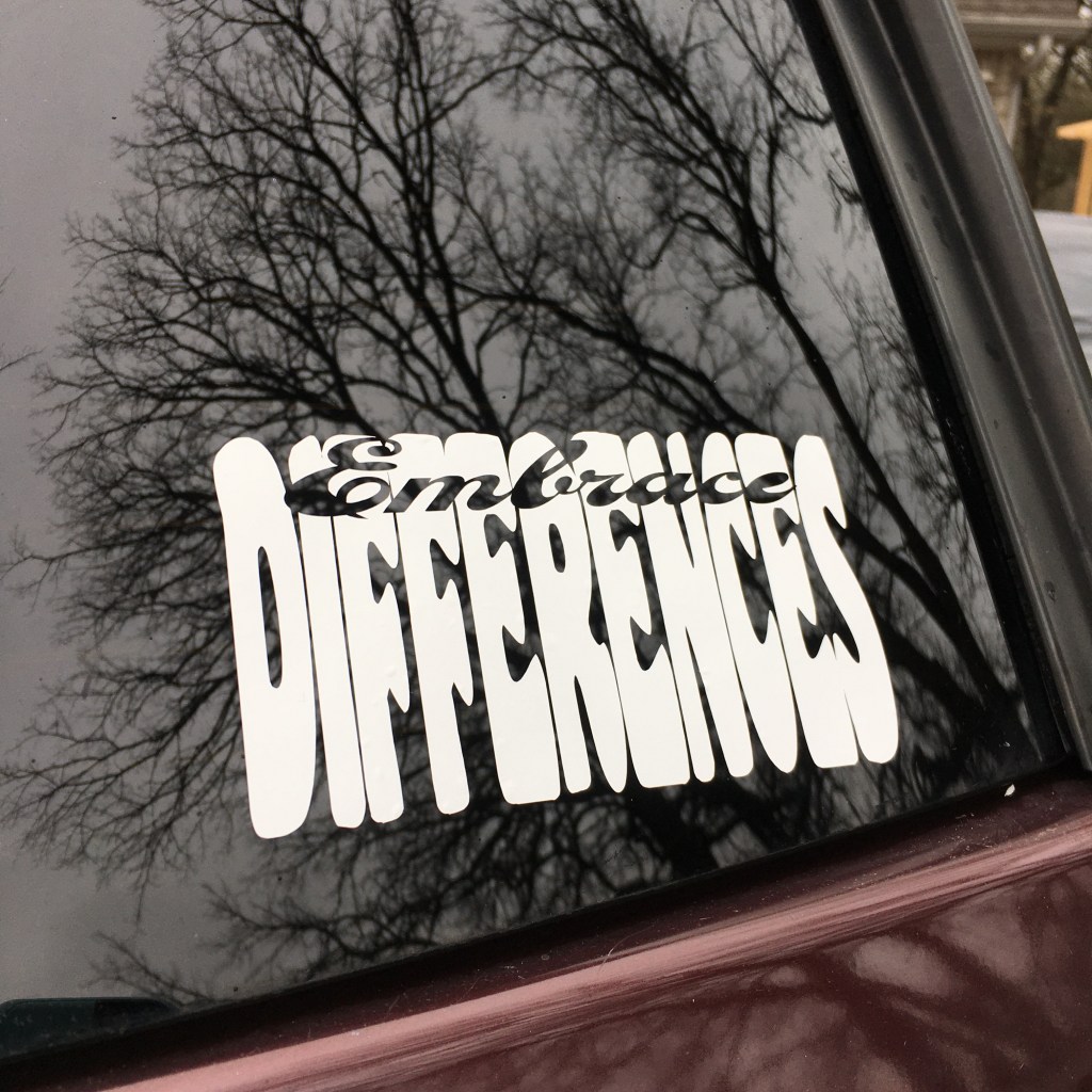 Uh oh, the outdoor vinyl cutouts are very addicting. I made the castle for my husband’s truck, the dragonfly for my vehicle, and then the other corner of my window needed updating too. I just happened to have some white premium vinyl that I used on the kid’s water bottles. That stuff has stuck on fast even with weekly trips through the dishwasher. But what to advertise to everyone sitting behind me at traffic lights? I wanted some variation on the theme that it is good that everyone is different; it would be a terrible if we were all the same. But that is a lot of text to squeeze onto a sticker. So I used two words: Embrace differences.