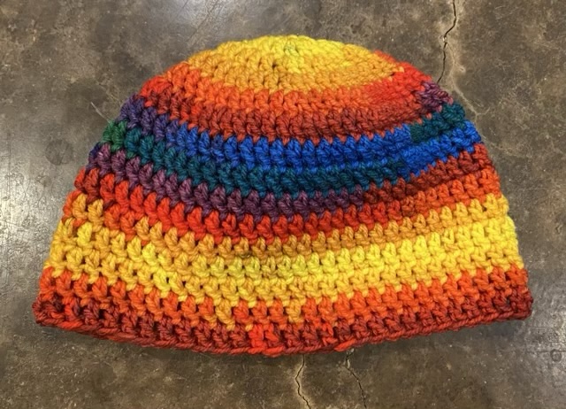 I spent last week watching as much of the Sweet Adeline International Convention webcast live as I could. This gave my fingers long stretches of idle time, which I filled with nålbinding a hat. My parents-in-law recently visited Ireland, and brought me back some Aran wool, which is lovely to nålbind because it tears apart easily and felts back together well.