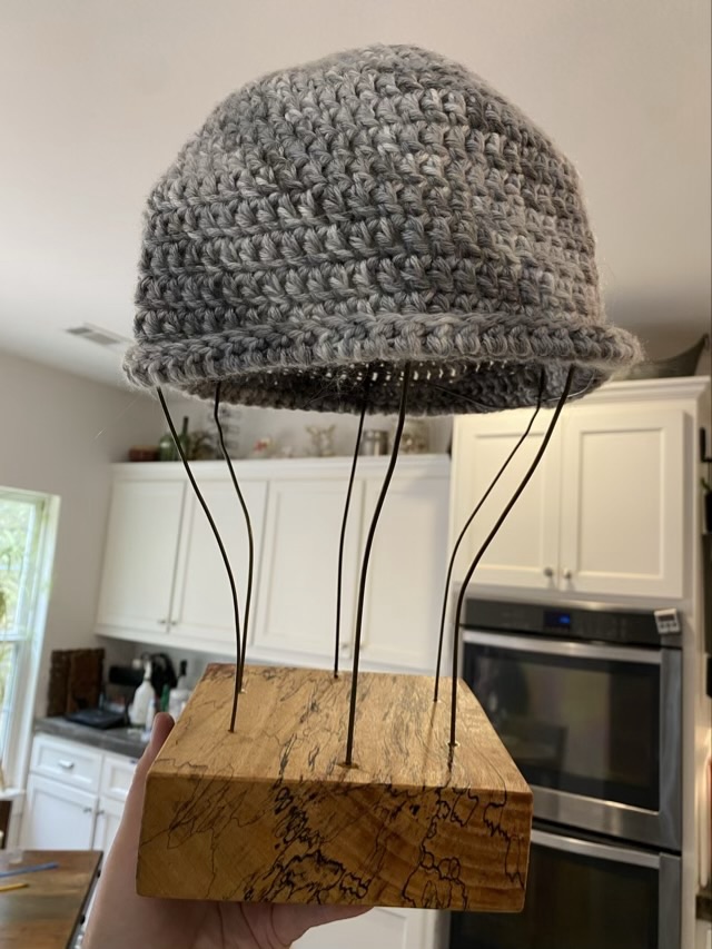 I didn’t want to finish the hat with decreases, so I stitched a free length of Oslo chain, spiraled it into a rosette, and stitched down the bottom edge.