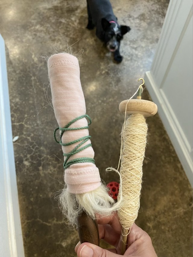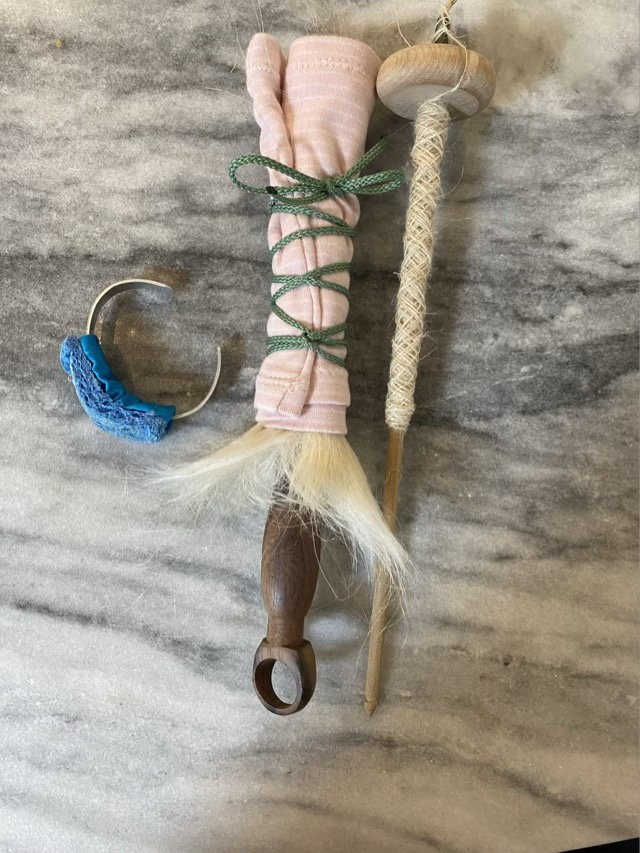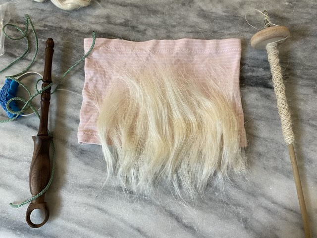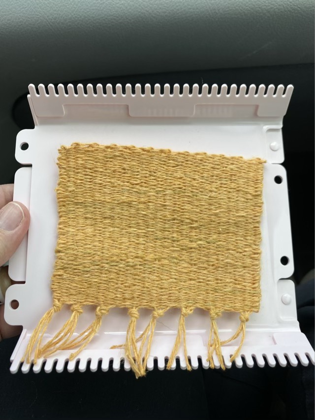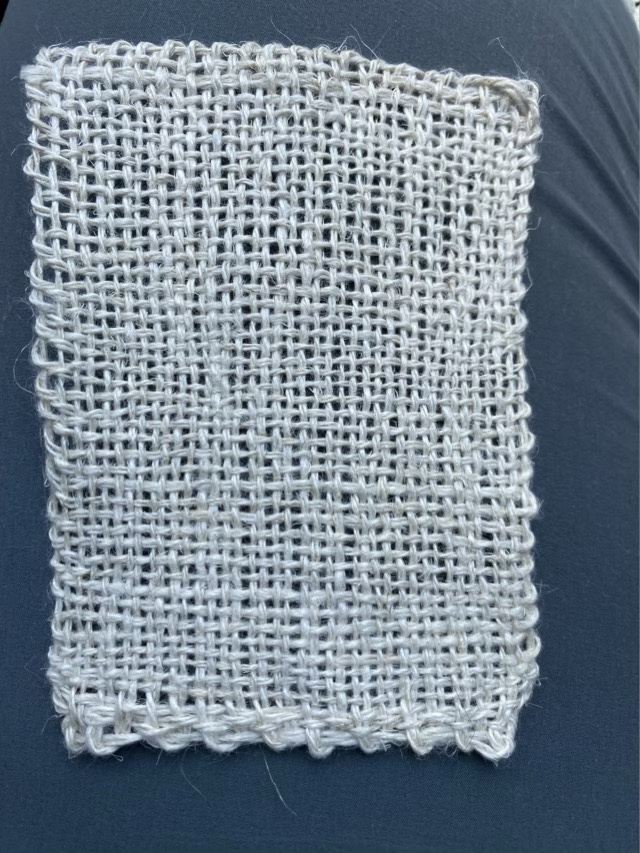 I finished another fiber page (really I did three together, but I’m going to spread it out in this blog). This page is about hemp. The hemp top, combed hemp fibers, came in a collection of plant fibers as a gift from my sister. I spun the singles on a drop spindle, then made a two-ply yarn using a different drop spindle. The fiber was nice to spin, but the resulting yarn was stiff and scratchy, even after setting the twist by boiling. Hemp is usually used to make rope and strong fabrics, certainly not anything you would want next to your skin. I made a knitted swatch with size 4 needles, a crocheted round with size C hook, and a woven sample with four salvages using a Clover mini-loom and doubling the warp threads. Even though I wouldn’t make clothing with this yarn, I think it is the neatest page I’ve done so far.