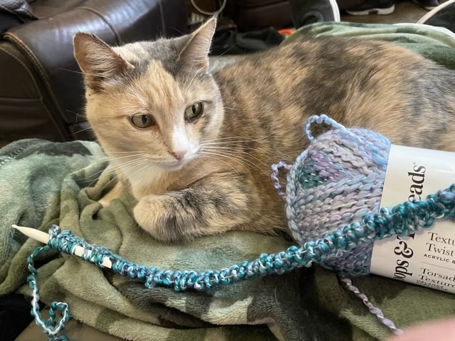 This is not my usual lap cat. Sophie, the outside cat that adopted us and moved inside, has decided that laps are warm and cozy, especially with a fuzzy blanket. She has not learned knitting etiquette yet, though, and thinks the yarn is for play. We’re working on it. Right now it is a balance of encouraging lap time and gently discouraging yarn gnawing.