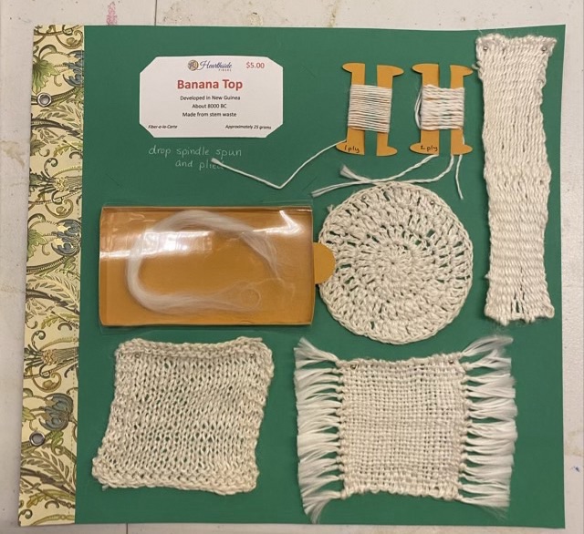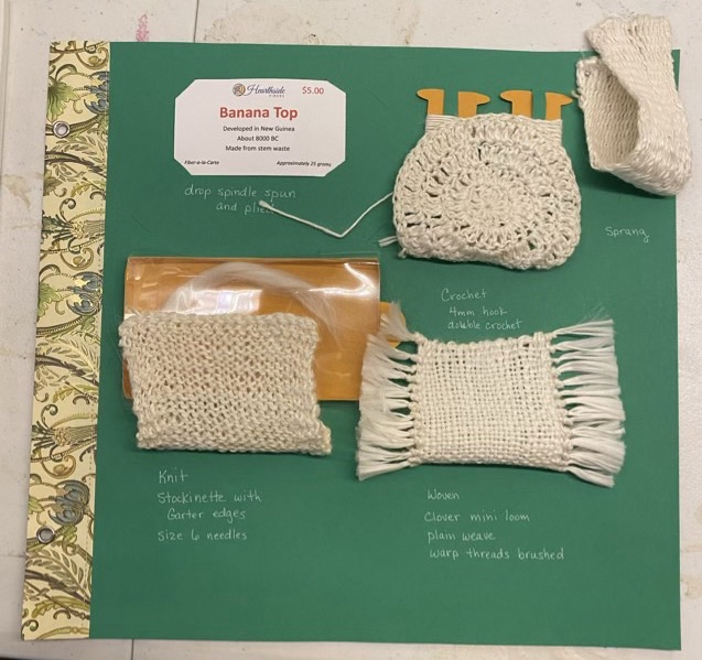 Photo description: counterclockwise from top left: card from Hearthside fibers that reads “Banana top, Developed in New Guinea, about 8,000 BC, made from stem waste”, unspun fiber, knit swatch, woven swatch, crocheted swatch, sprang swatch, two ply yarn, and single ply yarn