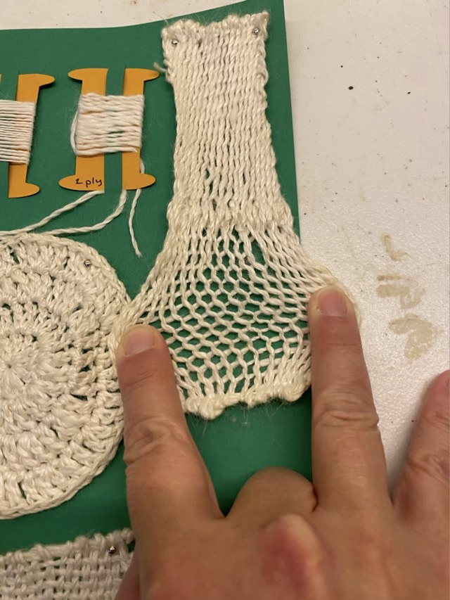 I made unadorned swatches to show the texture in the yarn that was also a result of the variations in thickness. My sprang swatch blocked well and has a lovely horizontal stretch.